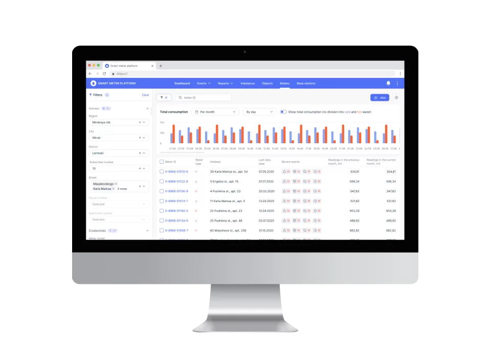 - Менеджмент приборов в процессе эксплуатации, предоставление и ограничение доступа к показаниям и данным приборов и базовым станциям.